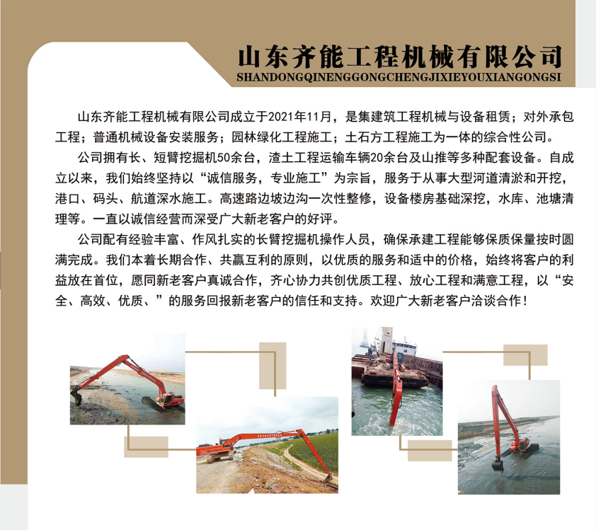 公司配有经验丰富、作风扎实的长臂挖掘机操作人员,确保承建工程能够保质保量按时圆满完成。我们本着长期合作、共赢互利的原则,以优质的服务和适中的价格,始终将客户的利益放在首位,愿同新老客户真诚合作,齐心协力共创优质工程、放心工程和满意工程,以“安全、高效、优质、”的服务回报新老客户的信任和支持。欢迎广大新老客户洽谈合作!