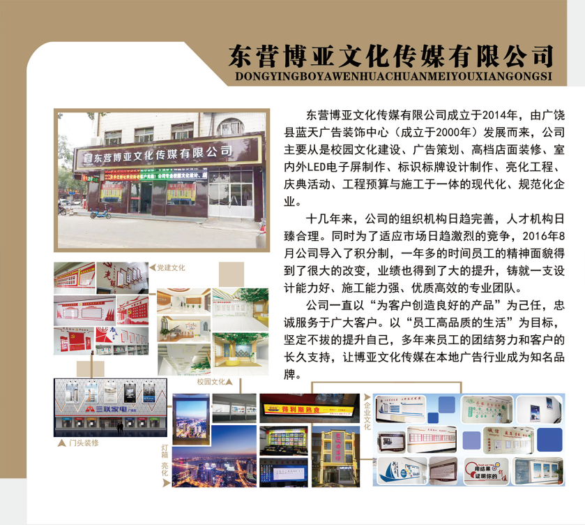 东营博亚文化传媒有限公司成立于2014年,由广饶县蓝天广告装饰中心(成立于2000年)发展而来,公司主要从是校园文化建设、广告策划、高档店面装修、室东营博亚文化传媒有限公司内外LED电子屏制作、标识标牌设计制作、亮化工程、庆典活动、工程预算与施工于一体的现代化、规范化企业。